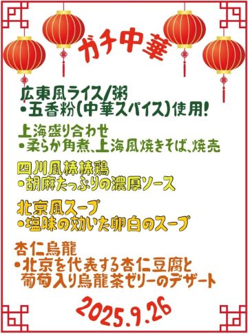 ・9月実施した『ガチ中華』は、四川、北京、上海、広東の地域別メニューを提供しました。病院だと辛いものは難しいので、通常の食事では提供しないようなメニューに挑戦してみました。
