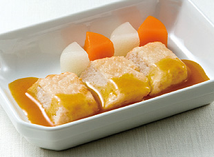 介護食品の『やさしい素材』はユニバーサルデザインフード舌でつぶせるかたさの介護食品です。
